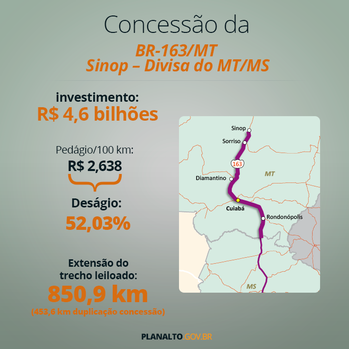Já a Odebrecht venceu o leilão feito pela Agência Nacional de Transportes Terrestres (ANTT) para a concessão de outro trecho da BR-163, em Mato Grosso, com uma proposta de R$ 0,02638 por quilômetro rodado – R$ 2,2638 para cada 100 quilômetros. O trecho tem 850,9 quilômetros e tem investimentos previstos de R$ 4,6 bilhões. O consórcio deverá duplicar 453,6 quilômetros da rodovia em cinco anos.